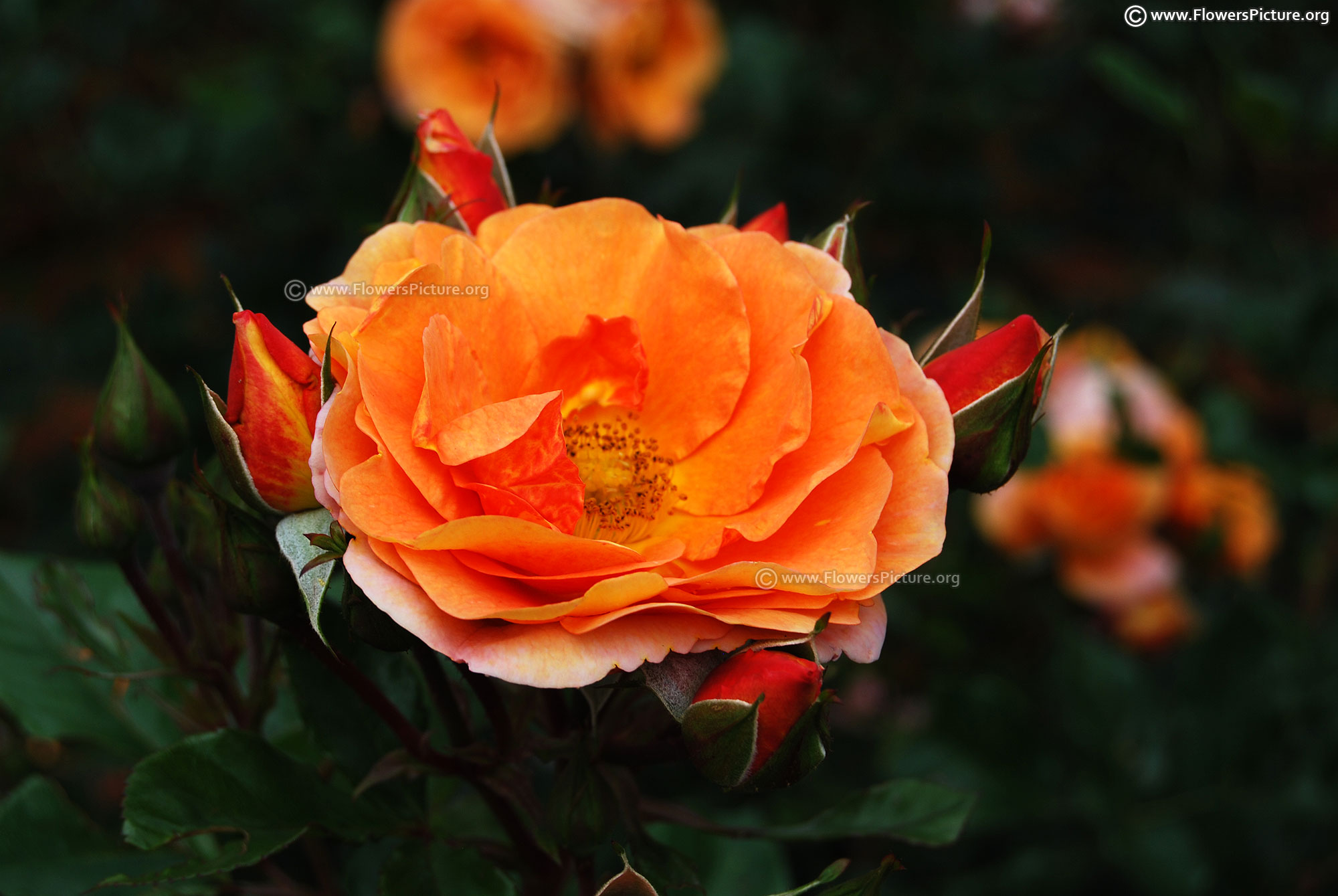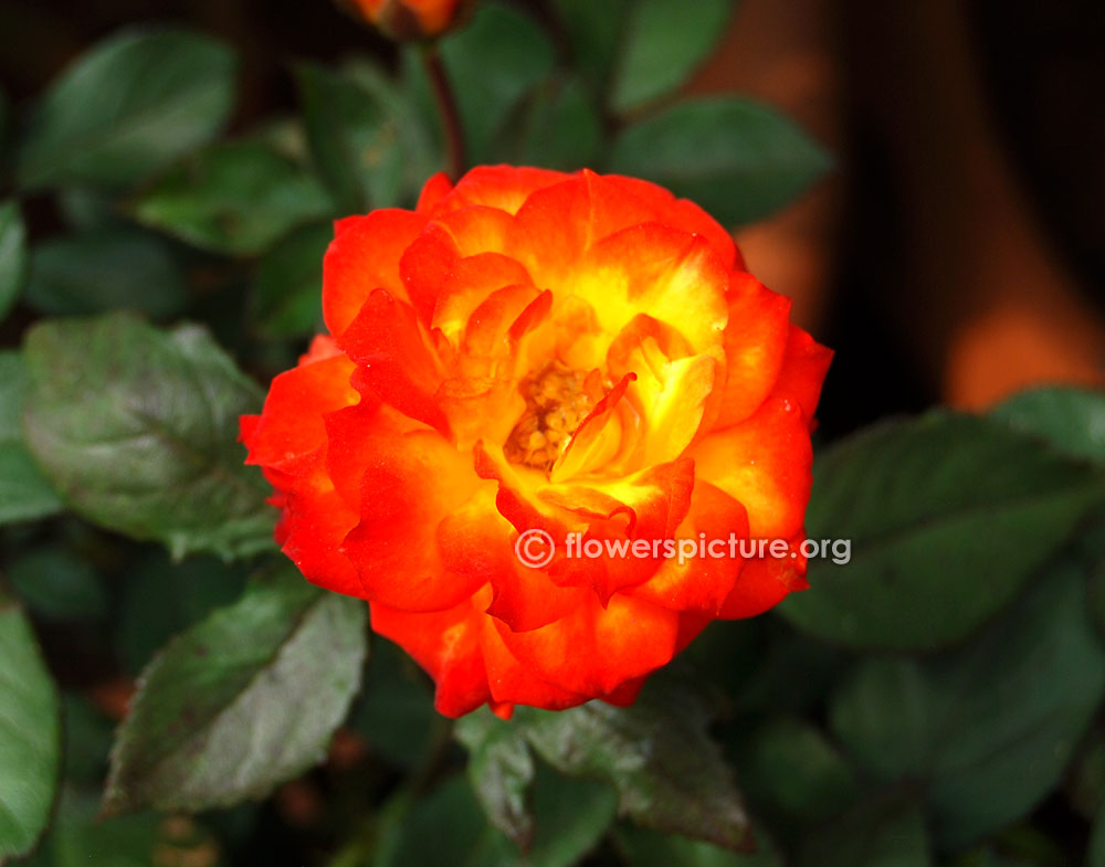 Flowers : Small, bicolor, showy, fragrant, deep orange with yellow mixed petals, deep green foliage, best for pots display