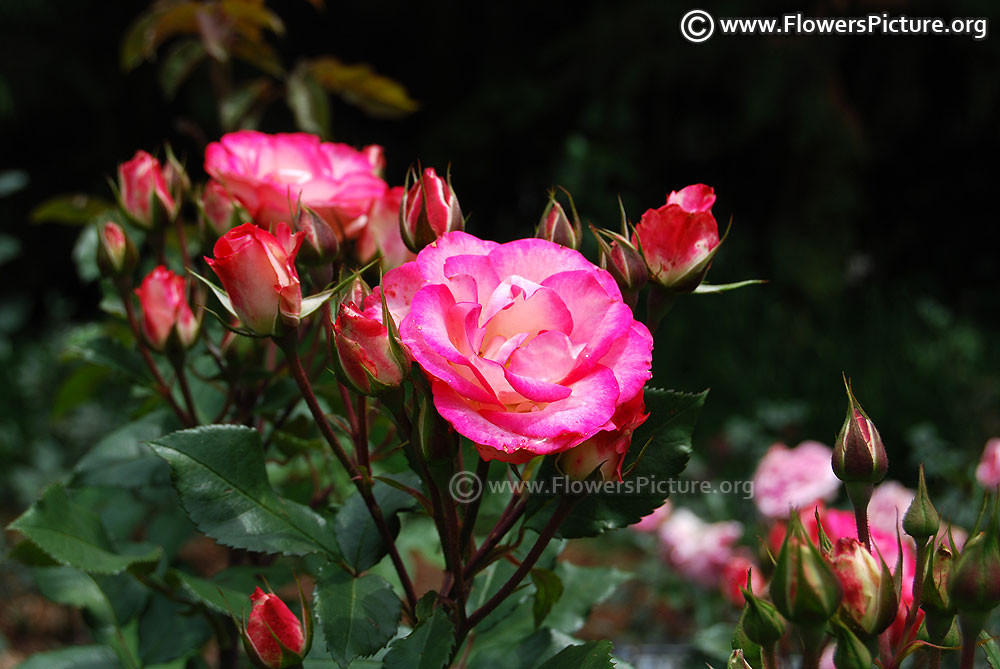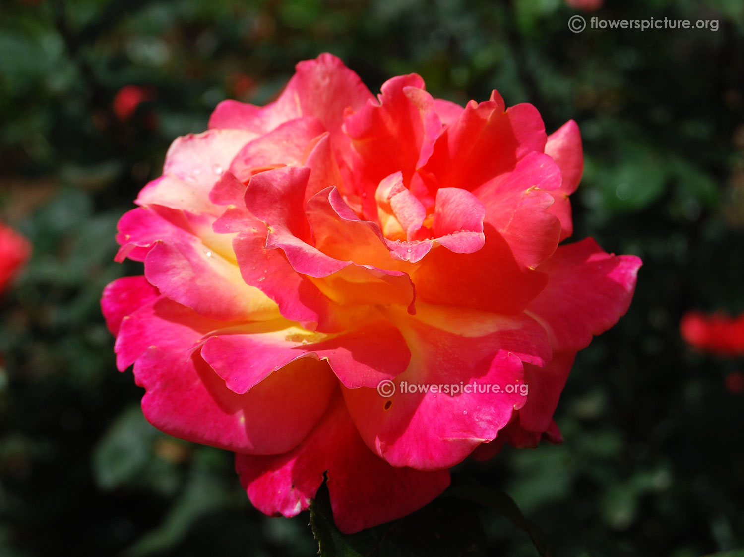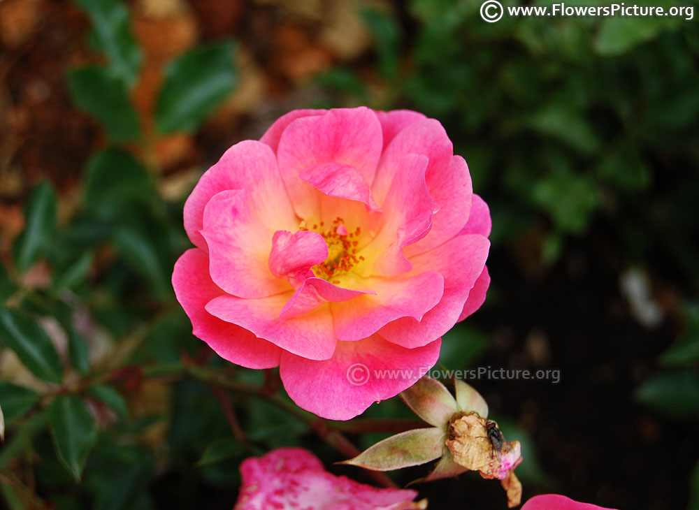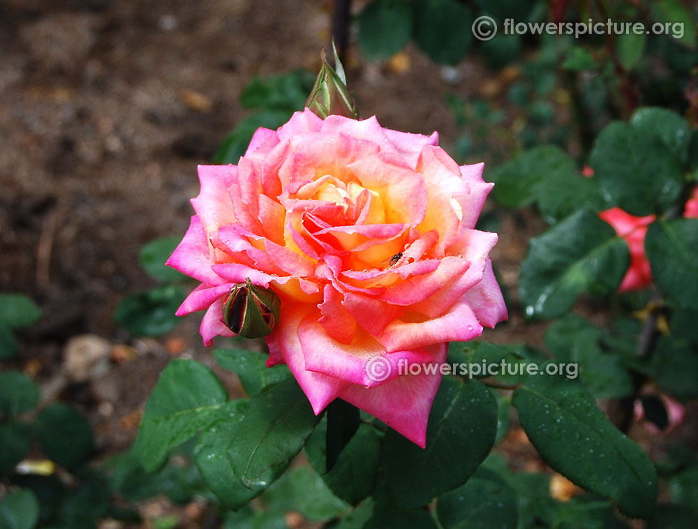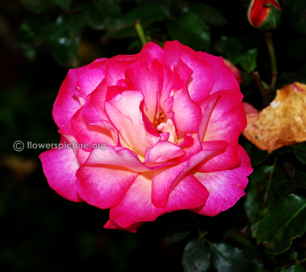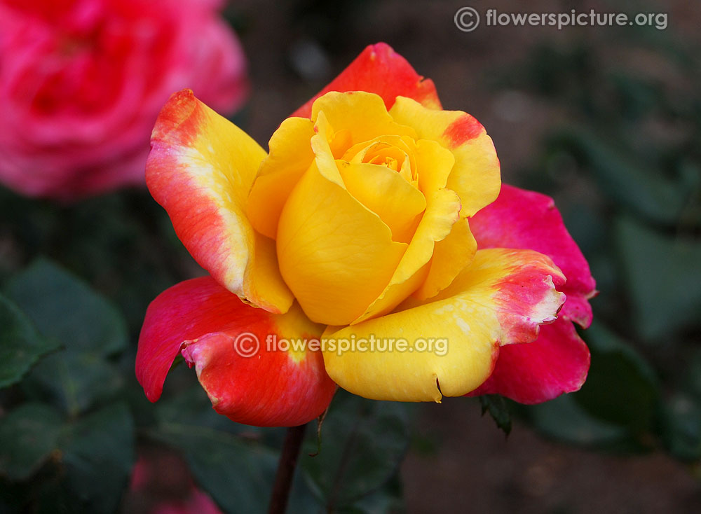 Flowers : DeepPink with yellow, bicolour, large, showy, hybrid tea rose, fragrant, colourful