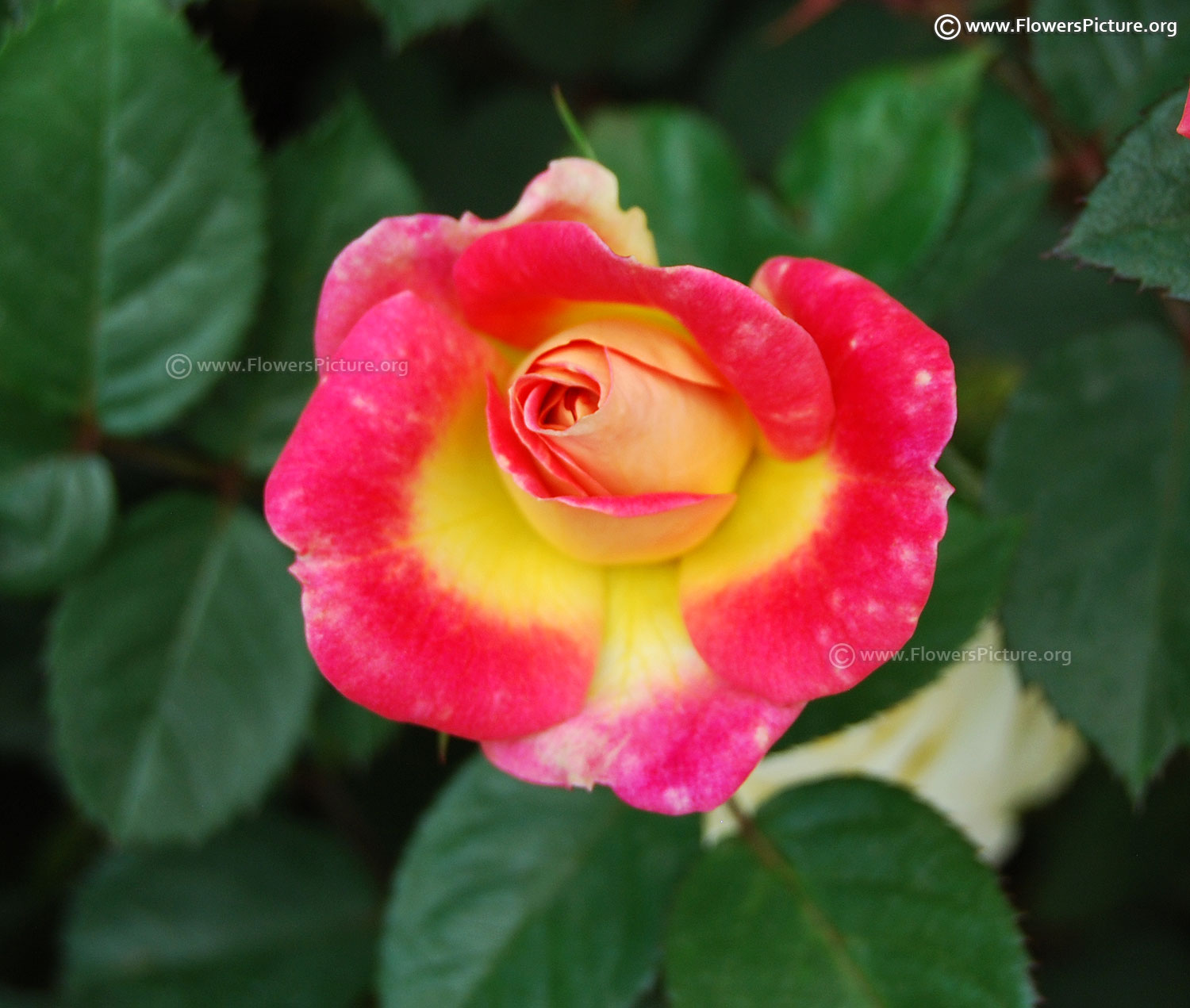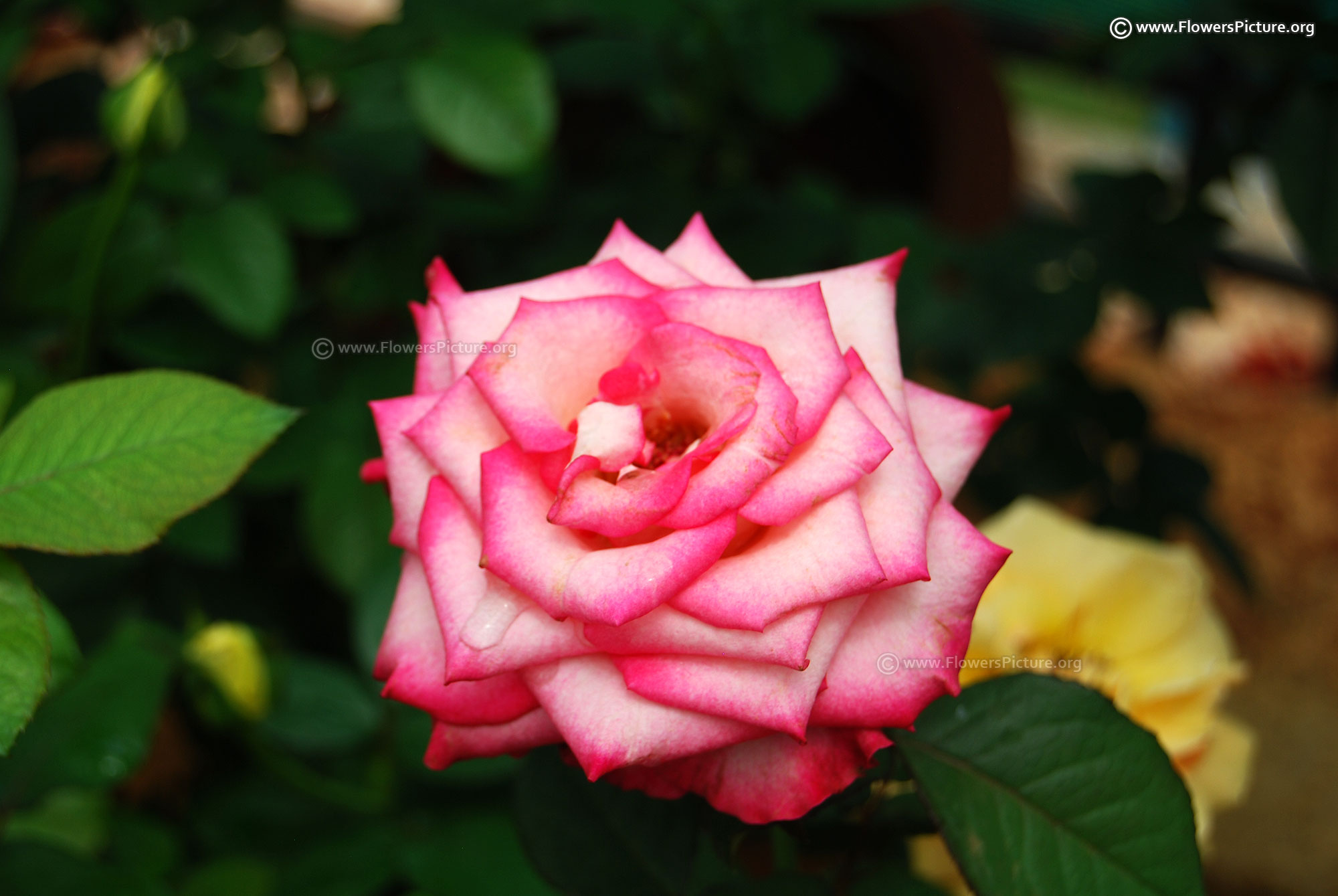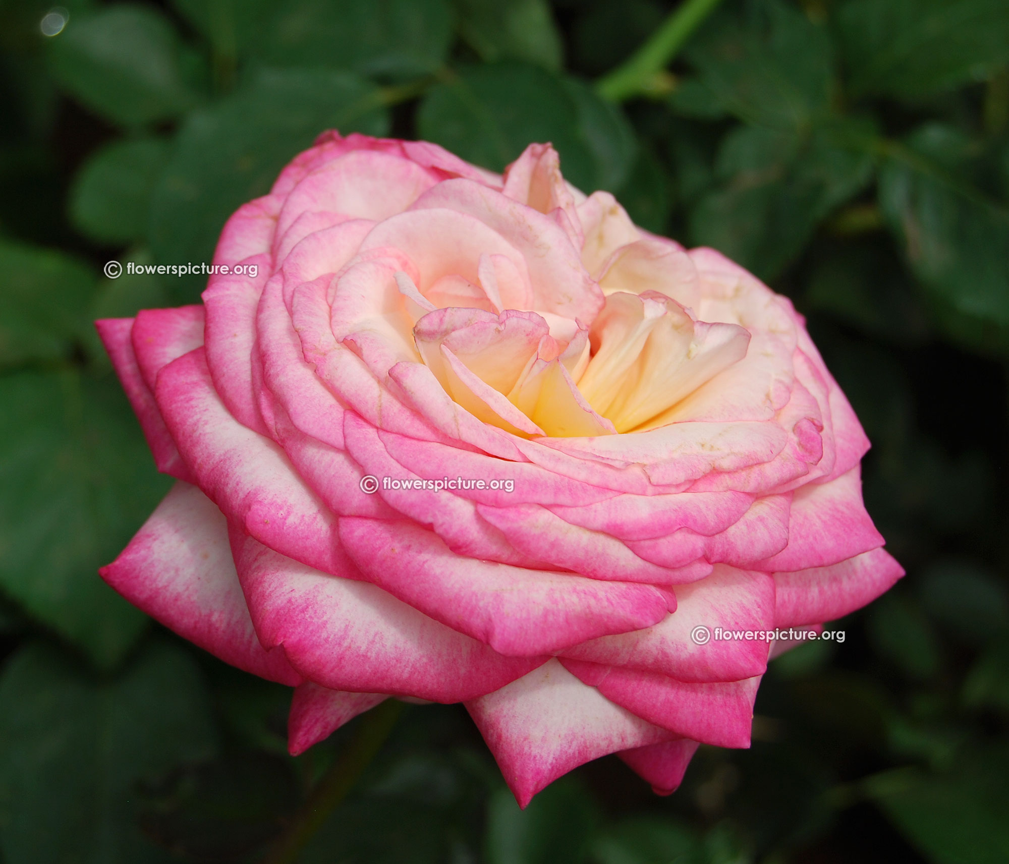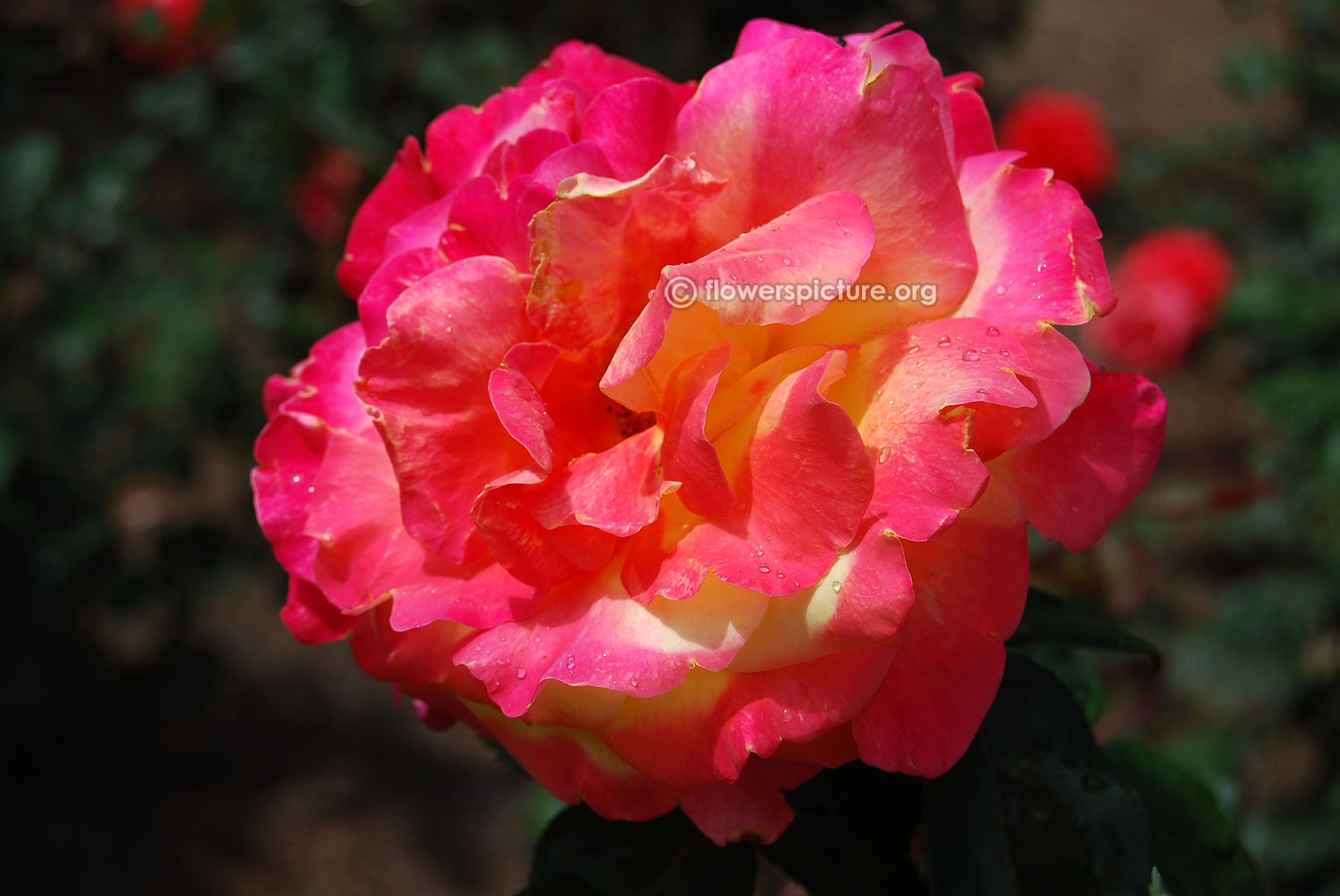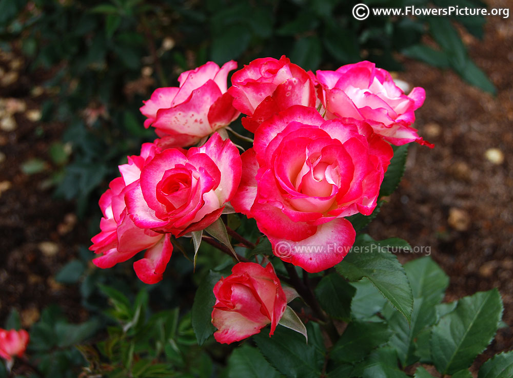 Flowers : DeepPink with yellow, bicolour, large, showy, hybrid tea rose, fragrant, colourful