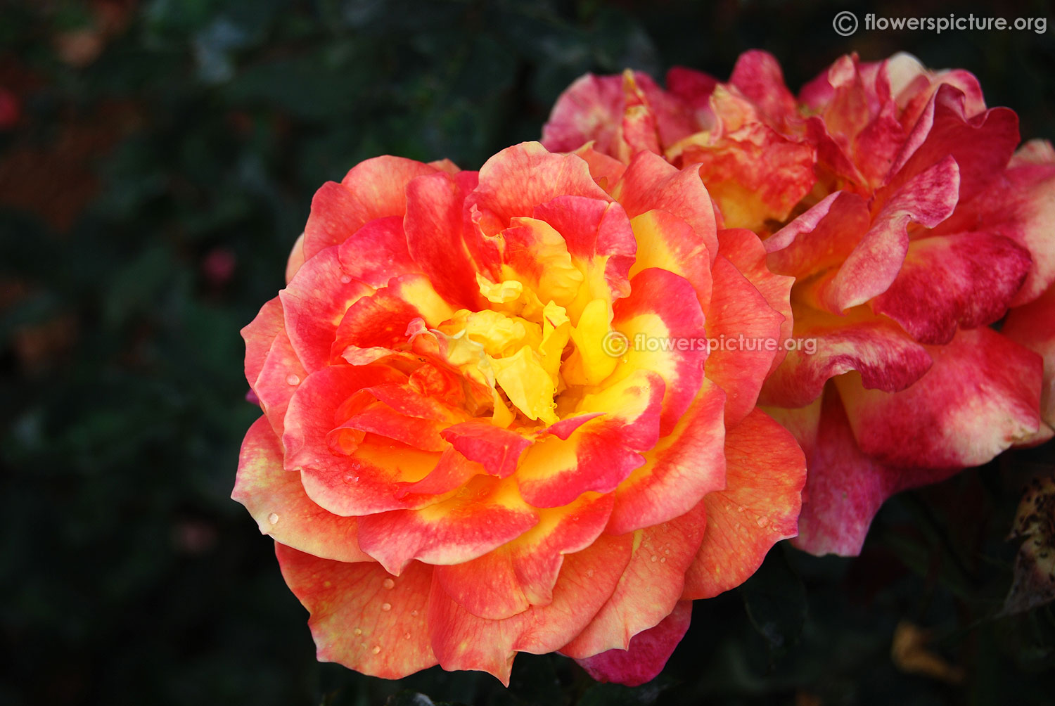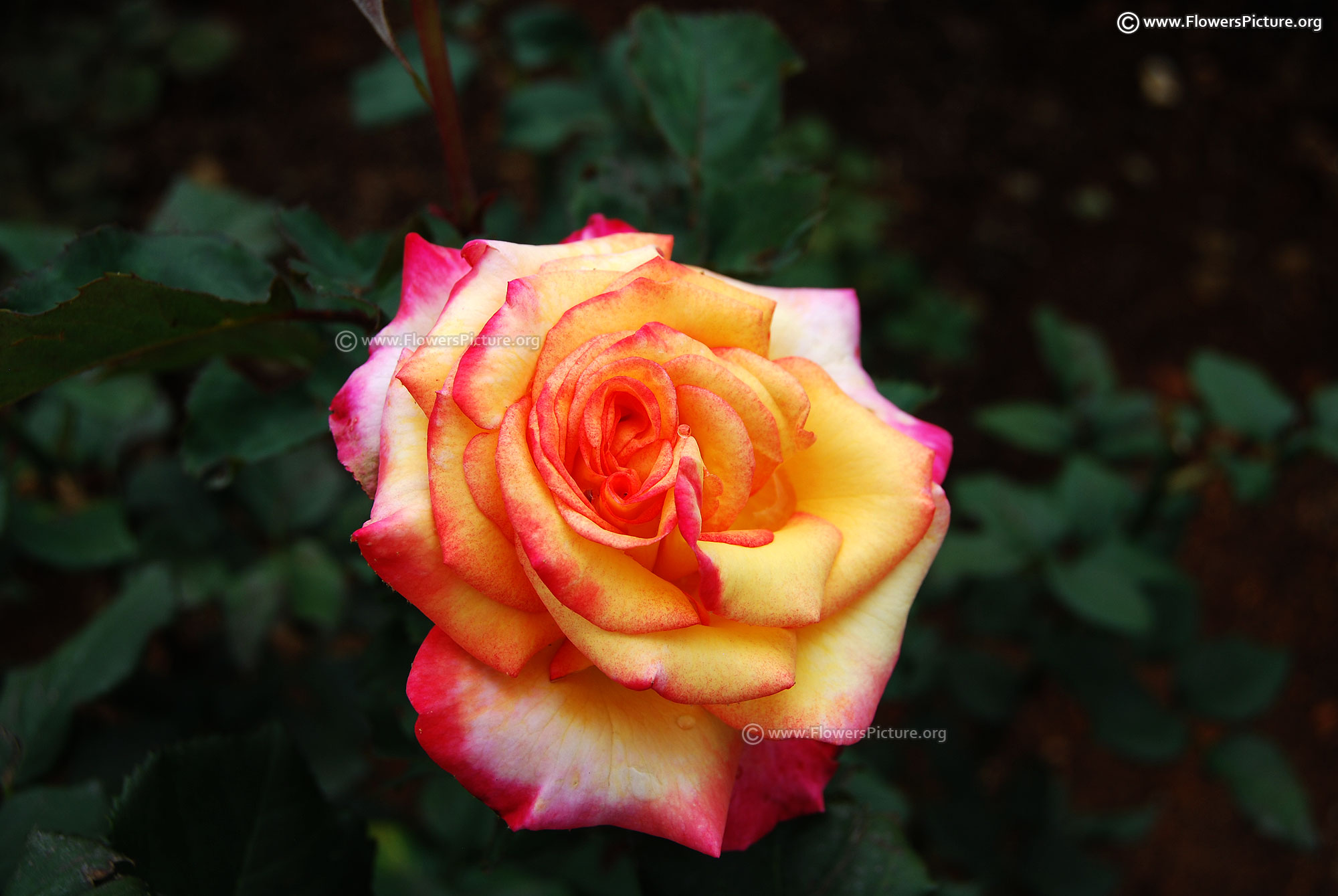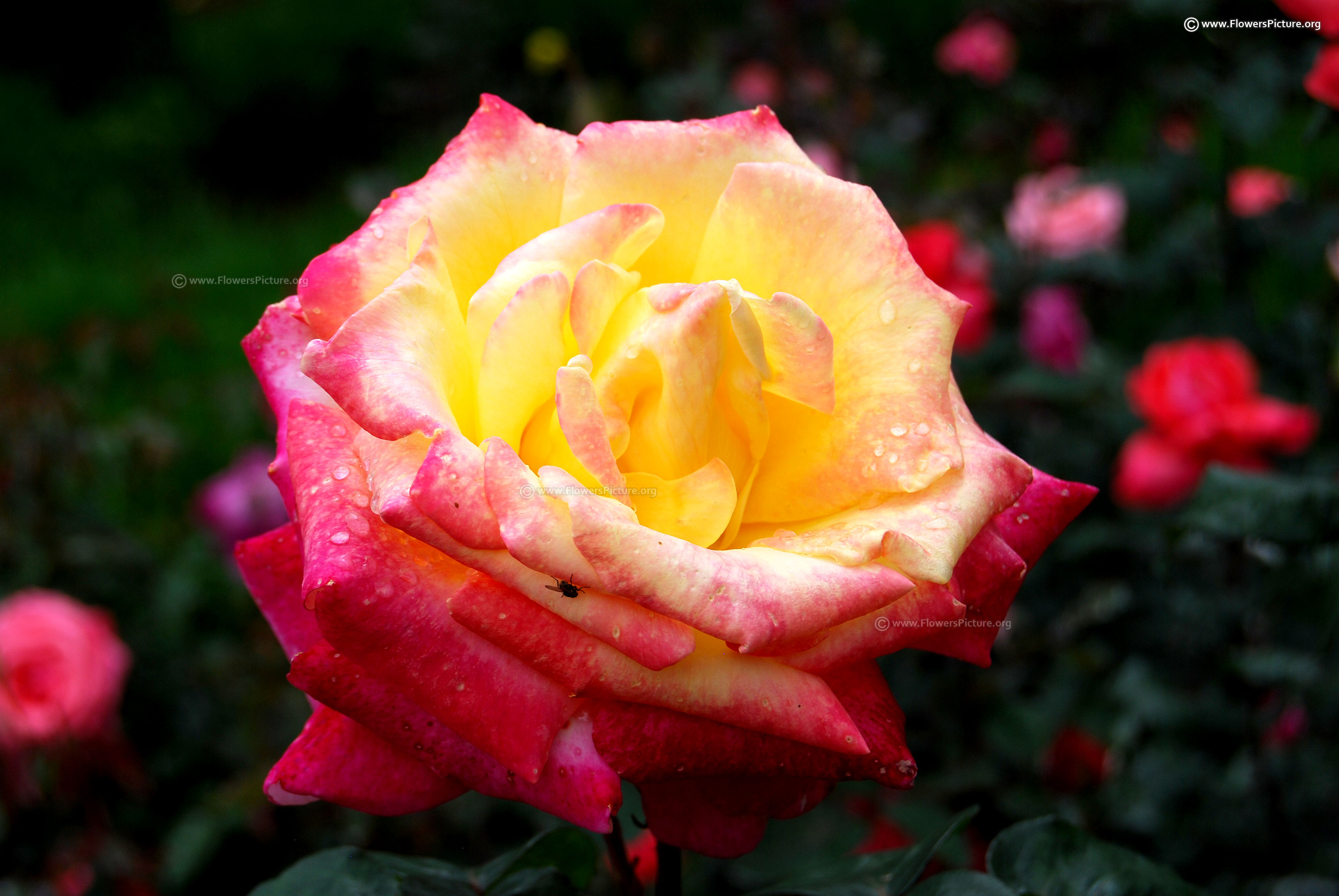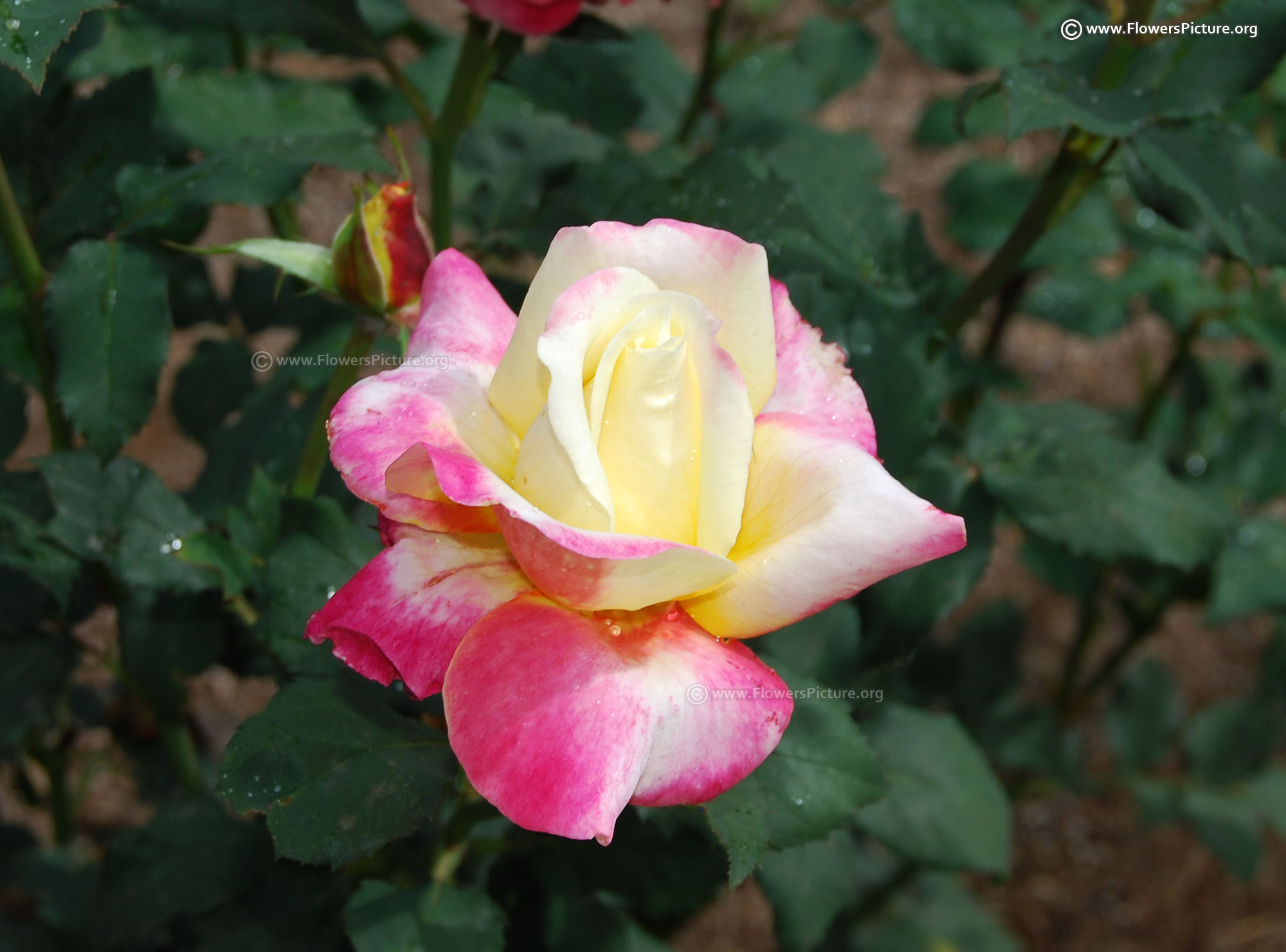 Flowers : DeepPink with yellow, bicolour, large, showy, hybrid tea rose, fragrant, colourful