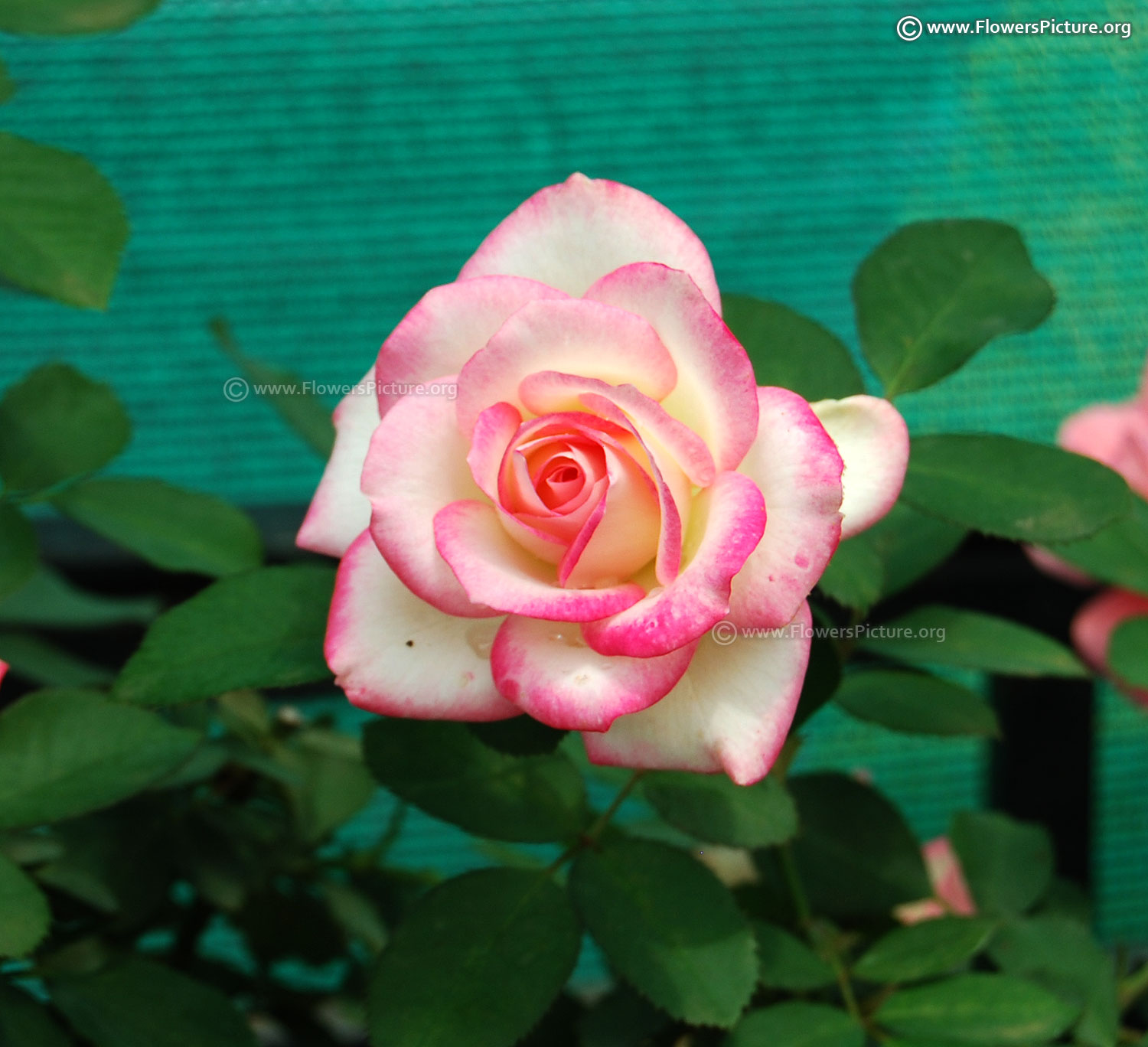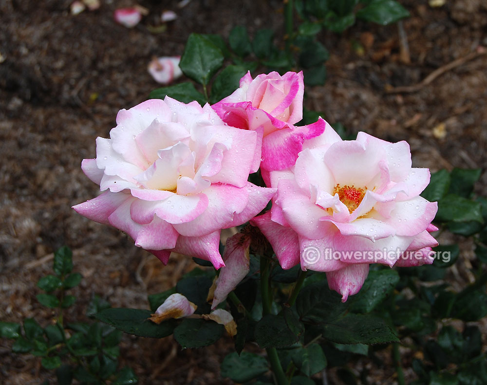 Flowers : Pink & white bicolour, large, showy, hybrid tea rose, fragrant, colourful
