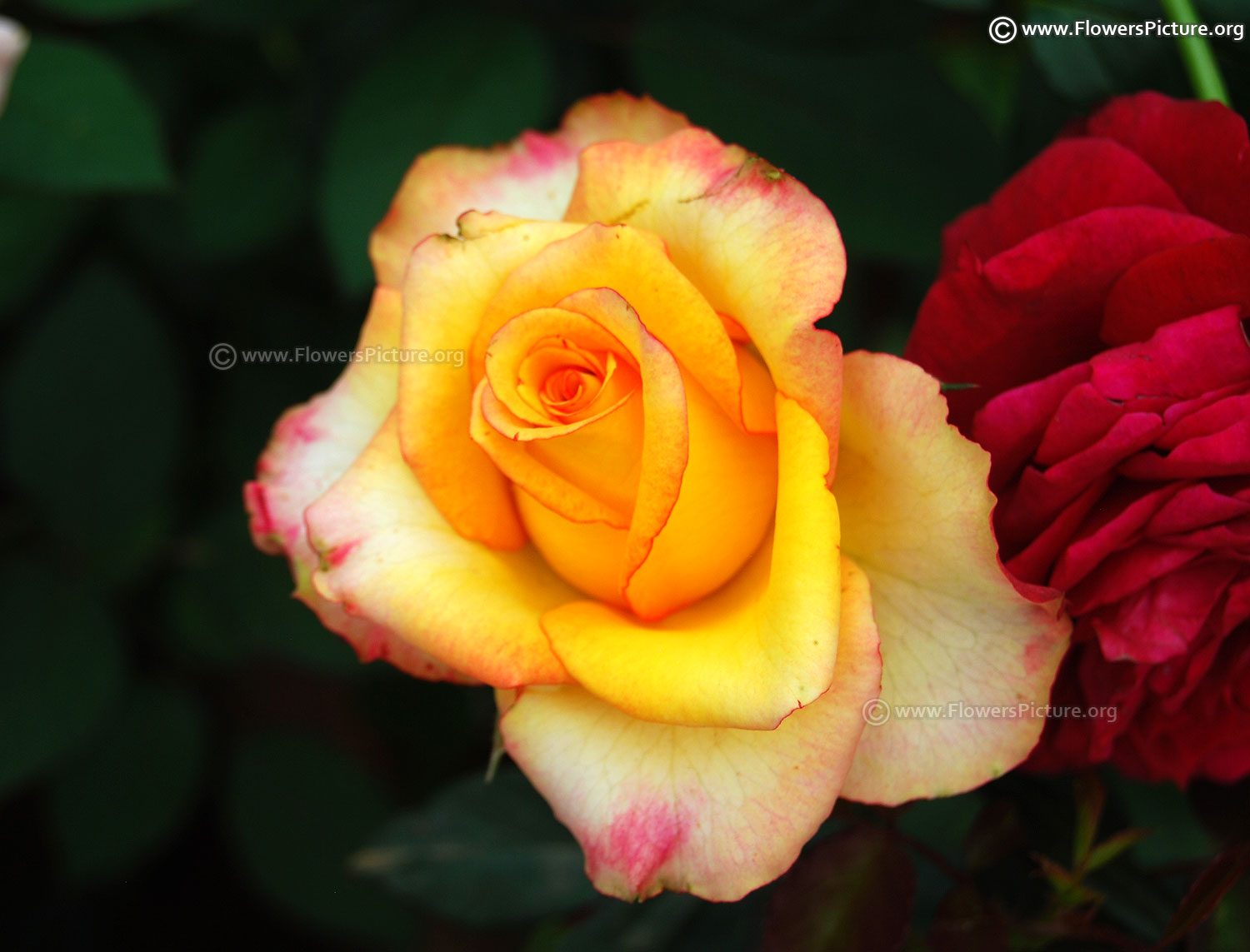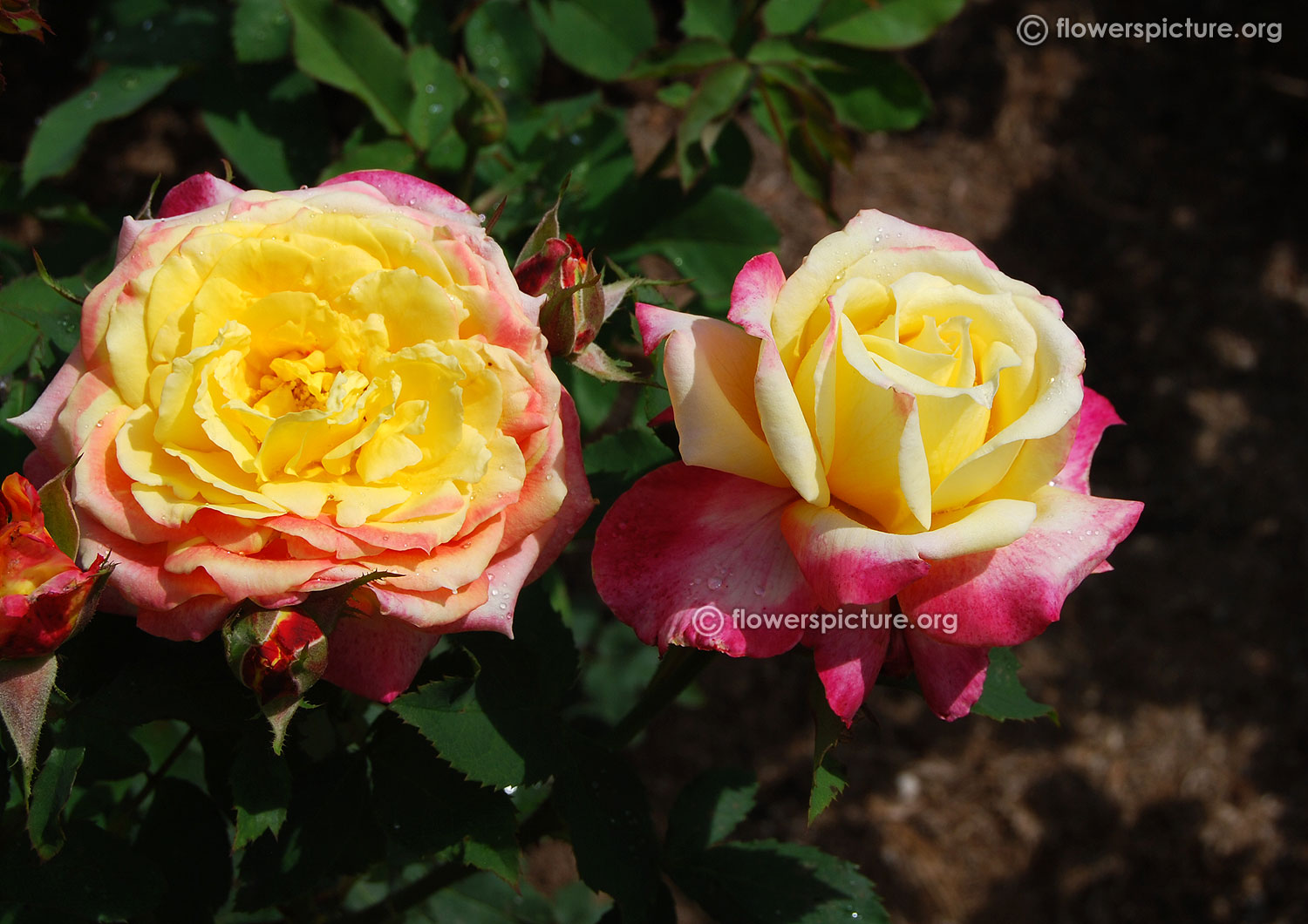 Flowers : Yellow, magenta red, bicolour, showy, fragrant, hybrid tea rose
