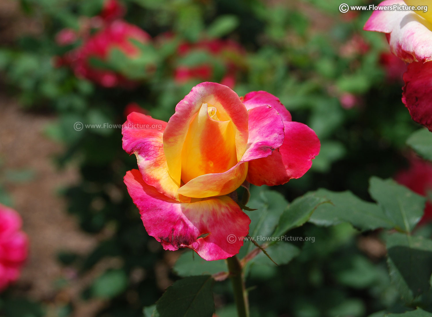 Flowers : hot pink & yellow, bicolour rose, Medium blooms, showy